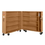 The Model 100 JOBMASTER™ Folding Rolling Cabinet is 65in high, approximately 125in wide when fully opened and has a capacity of 60.9 cu ft. This chest provides at-a-glance, easy-access shelving storage for tools, equipment and supplies. Shelves are 14in deep with a 1in hemmed lip and welded in place with a 12-7/8in minimum spacing between shelves. With a load capacity of 1,200lb. This cabinet works well for commercial electricians providing storage for small hardware and materials.