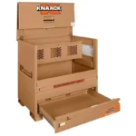 The Model 79-D Piano Box with Junk Trunk is a professional jobsite tool box with an impressive 36.2 cubic feet capacity that enables you to store your most essential tools securely on the jobsite. Measuring 48 inches wide by 49 inches tall, the job box is ideal for every trade with full-width shelves that are perfect for organizing equipment for convenient storage. The tool storage box also comes with an independent locking drawer for quick yet secure access to your most in-demand tools. The jobsite box’s impressive raised chest floor design ensures easy access to equipment at the bottom of the chest. With a bi-fold cover that folds firmly out of the way and fits the width of a full-size truck bed perfectly, this metal storage box ensures you’re ready for anything. Best of all, the powder-coated steel storage box comes with a WATCHMAN IV Lock System with recessed lock housing for advanced security at the jobsite. When open, the metal storage box is 78 inches high. When closed, it is 49 inches high and can also be used as a work table. It also comes with a KNAACK Padlock that fits perfectly in the lock box.