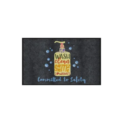 These mats provide important reminders for guests and employees, and are designed for placement at hand-sanitizing stations to keep floors dry and safe by catching any excess liquid that falls. The beveled edges provide a safe transition from the floor to the mat, and these mats are certifed high traction by the National Floor Safety Institute (NFSI). The PET (polyethylene terephthalate) carpet surface is made 50% post-consumer recycled plastic bottles and is naturally resistant to staining and fading. Made in the USA, these 2′ x 3′ mats measure approximately 24″ x 35″. Please note that mat sizes are approximate as rubber shrinks and expands in conjunction with temperature and time. Tolerable manufacturing size variance is 3-5%. These mats are compliant with Prop 65 and require no warning.