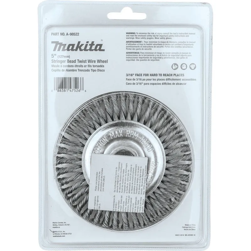Makita Stringer Bead Twist Wire Wheels are designed to work with angle grinders in a variety of surface preparation activities. The high quality carbon steel wire is engineered for long service life. It is ideal for hard to reach places, and for surface preparation on welds, piping and pipe grooves.