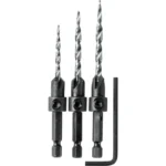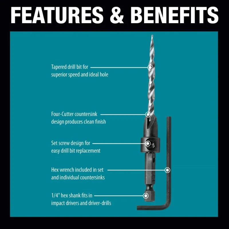 Makita has a deep line-up of drilling, driving and fastening tools and accessories. The Makita 3-Piece Countersink with Drill Bit Set with Hex Wrench (A-99661) is engineered for drilling pilot hole, countersinks and counterbores in one easy operation. The drill bit can be adjusted the desired drilling depth, and the 1/4”’ hex shank fits in impact drivers and driver-drills. The 3-Piece set includes #6, #8 and #10 countersinks plus a hex wrench.