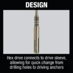 • Hex drive on bit connects with drive sleeve (not included), allowing for a quick change from drilling holes in masonry to driving anchors