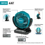 Added features include tilt-settings for better direction of air flow, and an adjustable hook for easy handling and hanging. The 3-stage automatic timer has 1-hour, 2-hour and 4-hour power-off selection. The fan is compatible with 18V LXT® batteries including 2.0Ah, 3.0Ah, 4.0Ah, 5.0Ah and 6.0Ah (batteries sold separately).