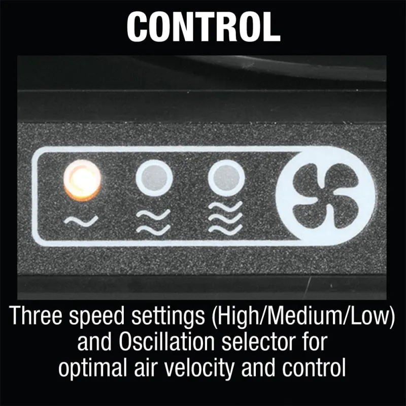 • Three speed settings (High/Medium/Low) and Oscillation selector for optimal air velocity and control
