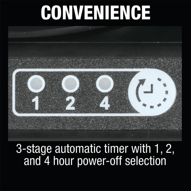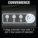 • 3-stage automatic timer with 1, 2, and 4 hour power-off selection