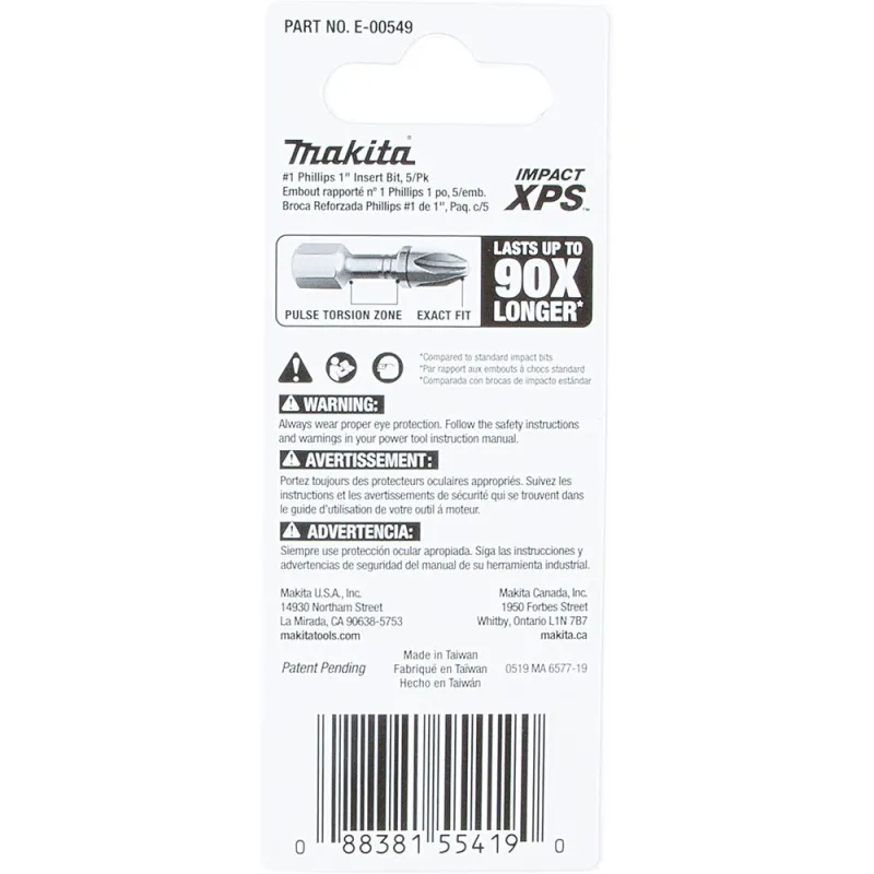 Makita® Impact XPS™ is new innovation in fastening with insert bits and fastening accessories built for the demands of the professional contractor. The ImpactXPS #1 Phillips 1” Insert Bits are designed exclusively for use with high-torque impact drivers, and are engineered to last up to 90-times longer than standard insert bits. High-strength steel delivers longer bit life, and the precision-fit tip is engineered to prevent “cam-out” and stripping. The torsion section of the bit flexes under load to take pressure off of the bit tip for increased durability. The high quality steel construction is engineered for increased durability and features a matte nickel surface for best in class corrosion resistance. ImpactXPS #1 Phillips 1” Insert Bits are ideal for the most demanding jobs including deck building, framing, installing plywood subfloor, and more.