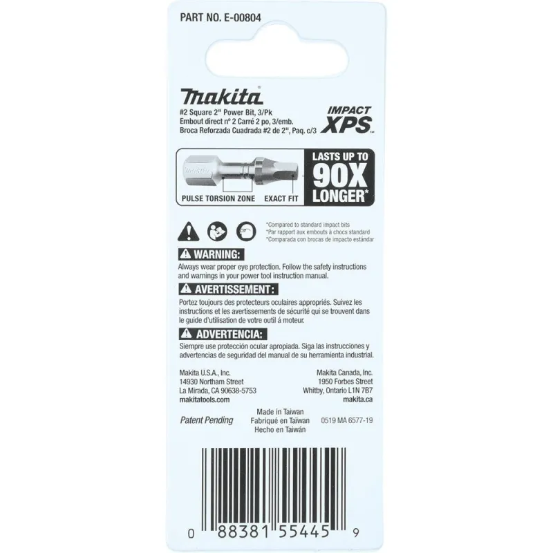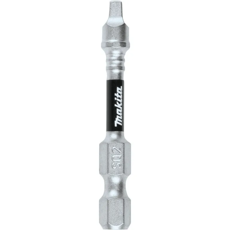 Makita® Impact XPS™ is new innovation in fastening with insert bits and fastening accessories built for the demands of the professional contractor. The ImpactXPS #2 Square 2″ Power Bits are designed exclusively for use with high-torque impact drivers, and are engineered to last up to 90-times longer than standard insert bits. High-strength steel delivers longer bit life, and the precision-fit tip is engineered to prevent “cam-out” and stripping. The torsion section of the bit flexes under load to take pressure off of the bit tip for increased durability. The high quality steel construction is engineered for increased durability and features a matte nickel surface for best in class corrosion resistance. ImpactXPS #2 Square 2″ Power Bits are ideal for the most demanding jobs including deck building, framing, installing plywood subfloor, and more.
