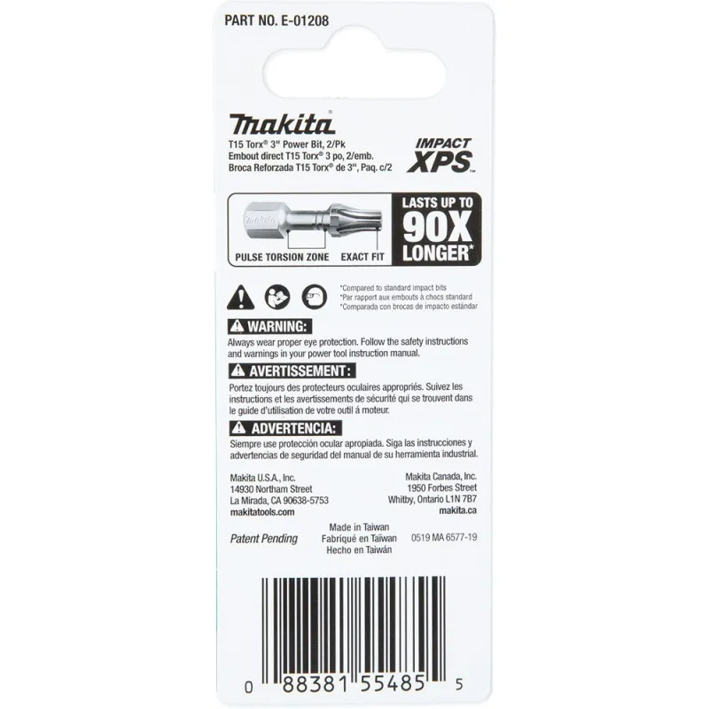 Makita® Impact XPS™ is new innovation in fastening with insert bits and fastening accessories built for the demands of the professional contractor. The ImpactXPS T15 Torx® 3″ Power Bits are designed exclusively for use with high-torque impact drivers, and are engineered to last up to 90-times longer than standard insert bits. High-strength steel delivers longer bit life, and the precision-fit tip is engineered to prevent “cam-out” and stripping. The torsion section of the bit flexes under load to take pressure off of the bit tip for increased durability. The high quality steel construction is engineered for increased durability and features a matte nickel surface for best in class corrosion resistance. ImpactXPS T15 Torx® 3″ Power Bits are ideal for the most demanding jobs including deck building, framing, installing plywood subfloor, and more.