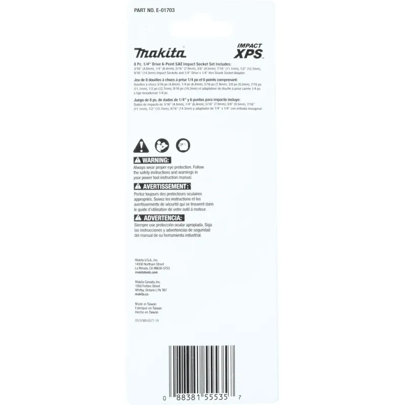 Makita E-01703 Impact XPS 8-Piece 1/4″ Drive 6-Point SAE Impact Socket Set