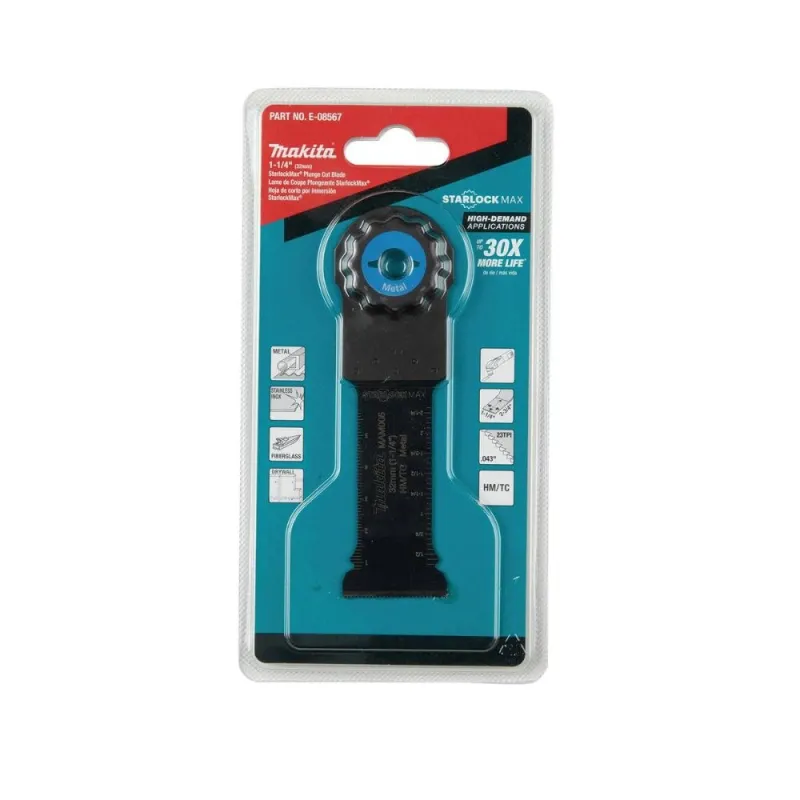 The Makita StarlockMax® Oscillating Multi-Tool 1-1/4″ Hard Metal with Tungsten Carbide Teeth Plunge Cut Blade for Metal Cutting is a versatile addition to the Makita Oscillating Multi-Tool (XMT04 sold separately). This plunge cut blade has 23 teeth-per-inch and a 2-3/4″ depth of cut ideal for precise straight cuts in extra deep cut applications. For use in a variety of surfaces including non-ferrous metal, sheet metal, nail-embedded wood, plasterboard, drywall, and more. The blade is color-coded blue for easy identification.
