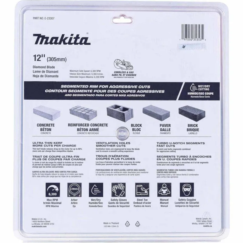 The 12″ Thin Kerf Diamond Blade, Segmented, General Purpose (E-23307) is for use with Makita 12” battery angle grinders and saws as well as competitor 12” models (sold separately). The thin kerf blade reduces drag on the tool motor to optimize battery run time. The Thin Kerf Diamond Blade delivers up to 80% more cuts per charge than competitive blades, and up to 2-times faster cutting when compared to standard blades.