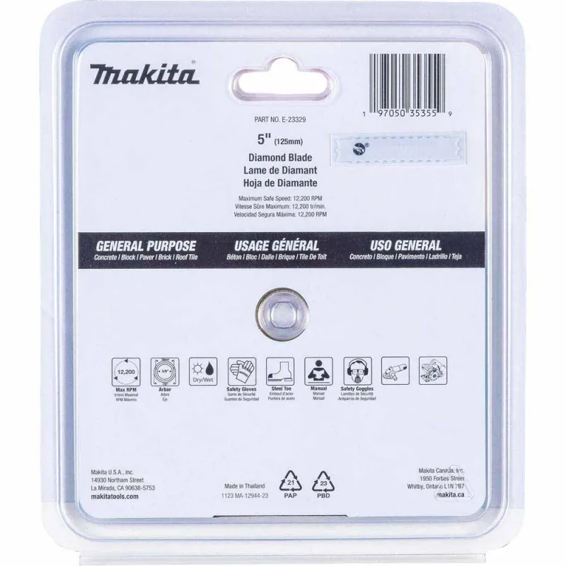 The Makita 5” Diamond Blade, Segmented Turbo, General Purpose, (E-23329) is for use with both Makita and competitor 5” angle grinders (sold separately). The industrial design along with 50% taller segments delivers longer life, as well as faster and smoother cuts.