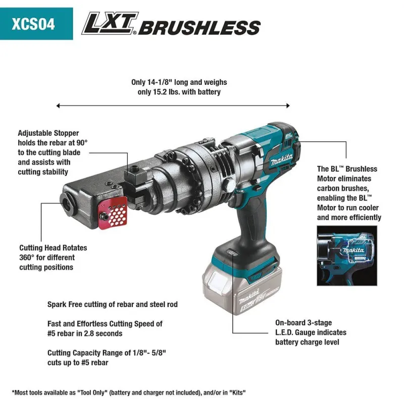 Makita XCS04T1 18V LXT® Lithium-Ion Brushless Cordless Rebar Cutter Kit (5.0Ah). Makita has delivered a cordless and spark-free cutting solution for rebar and steel rod with the 18V LXT® Brushless cordless rebar cutter (model XCS04T1). The XCS04T1 has a cutting capacity of up to #5 (5/8 In.) rebar, with a cutting head that rotates a full 360 degrees. Get 223 cuts of #5 rebar with one 18V LXT® 5.0 Ah battery. It is an ideal solution for work away from a power source or in remote locations.