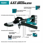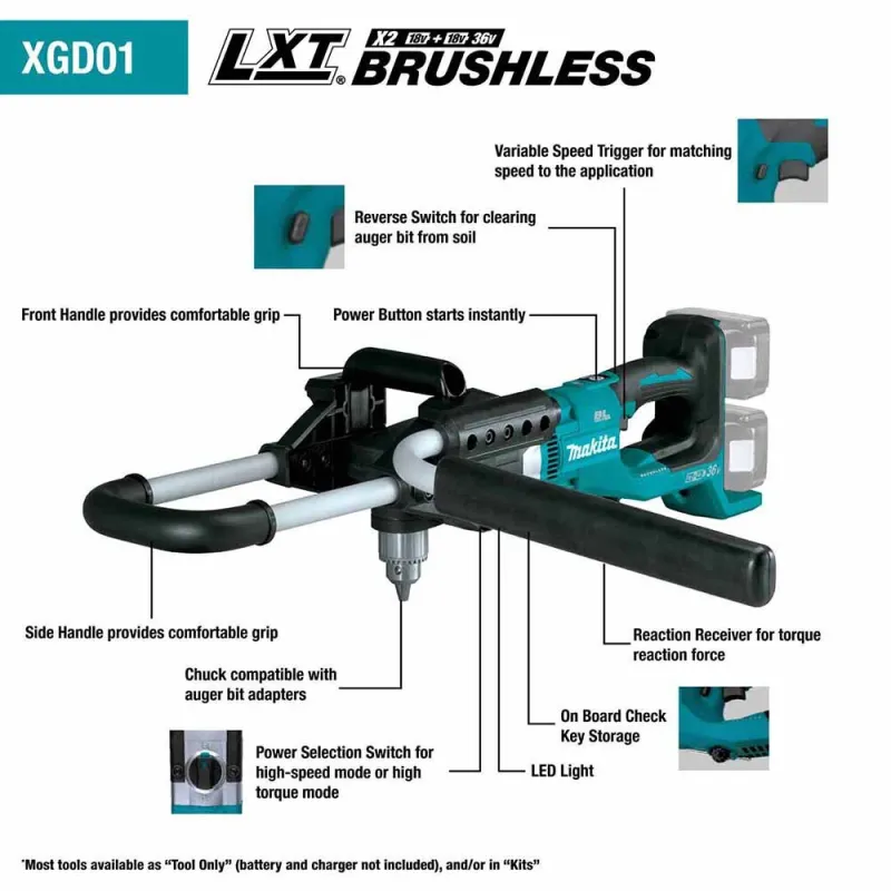 The Makita-built brushless motor delivers power equivalent to a 36cc gas earth auger. The XGD01Z can drill holes up to 8” wide and 41” deep. The extension bar, auger bit and blades are sold separately. There are 2 speed options (0-350 RPM, 0-1,400 RPM) to manage power and run time. A reverse switch clears the earth auger bit from high-resistance soil.