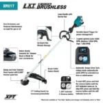 The Makita® 36V (18V X2) LXT® Brushless String Trimmer, Tool Only (XRU17Z) delivers power and ease-of-use for commercial applications. It has the power equivalent to a 30cc gas string trimmer, but without the hassles of gas. The cordless brush cutter has lower noise, zero emissions, and reduced maintenance. Features of the cordless string trimmer include a 17” cutting swath for increased productivity, a BL™ Brushless Motor for power, and a variable speed trigger switch to control cutting speed. The steel drive shaft provides less vibration and durability for longer life. It has three speed options (4,600/5,500/7,000 RPM). The Automatic Torque Drive Technology mode automatically shifts speeds to extend run time or add power. The reverse rotation function allows the user to quickly clear trimmer head of entangled grass and weeds. The string trimmer features Makita Extreme Protection Technology (XPT™). XPT™ is a protective seal inside the tool and is engineered for improved operation in harsh conditions by channeling water and dust from key internal components. It’s part of Makita’s expanding 18V LXT System, the world’s largest cordless tool system powered by 18V lithium-ion slide-style batteries. Makita 18V LXT Lithium-Ion Batteries have the fastest charge times in their categories, so they spend more time working and less time sitting on the charger. Batteries are sold separately.