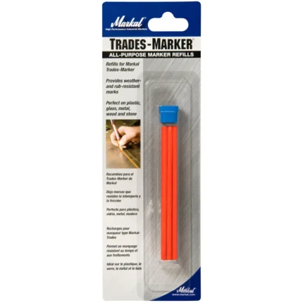 TRADES-MARKER has the marking versatility of a paper-wrapped grease pencil combined with simple push-button advance that helps reduce cost and waste. This refillable, all-surface marker leaves a wear-resistant mark and is safe for all surfaces.