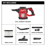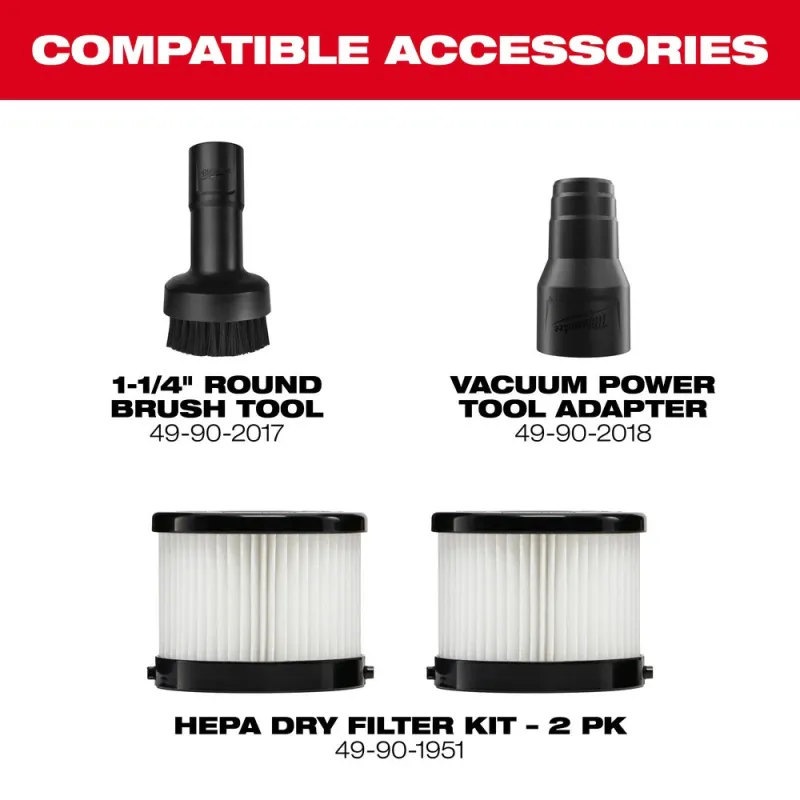 The M18™ Compact Vacuum provides users with the most powerful & adaptable handheld cleanup tool. A high performance motor creates best in class suction for cleanup of drywall dust, wood/metal shavings, and common jobsite debris. With a unique handheld design, the M18™ Compact Vacuum can be used in a wide variety of orientations and applications across the jobsite. For added versatility, the 0882-20 comes with (2) extension wands, 4’ flexible hose, crevice tool, floor tool, and removable HEPA filter. A clear view and easy to empty canister provides added convenience. As a part of the M18™ System of tools, it is powered by REDLITHIUM™ battery packs, which deliver up to 25 minutes of run time on a XC5.0 battery pack and 43 minutes of runtime on a HIGH DEMAND™ 9.0 Battery Pack.