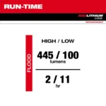 • High Mode: 445 Lumens- 2 Hrs. Low Mode: 100 Lumens- 11 Hrs.