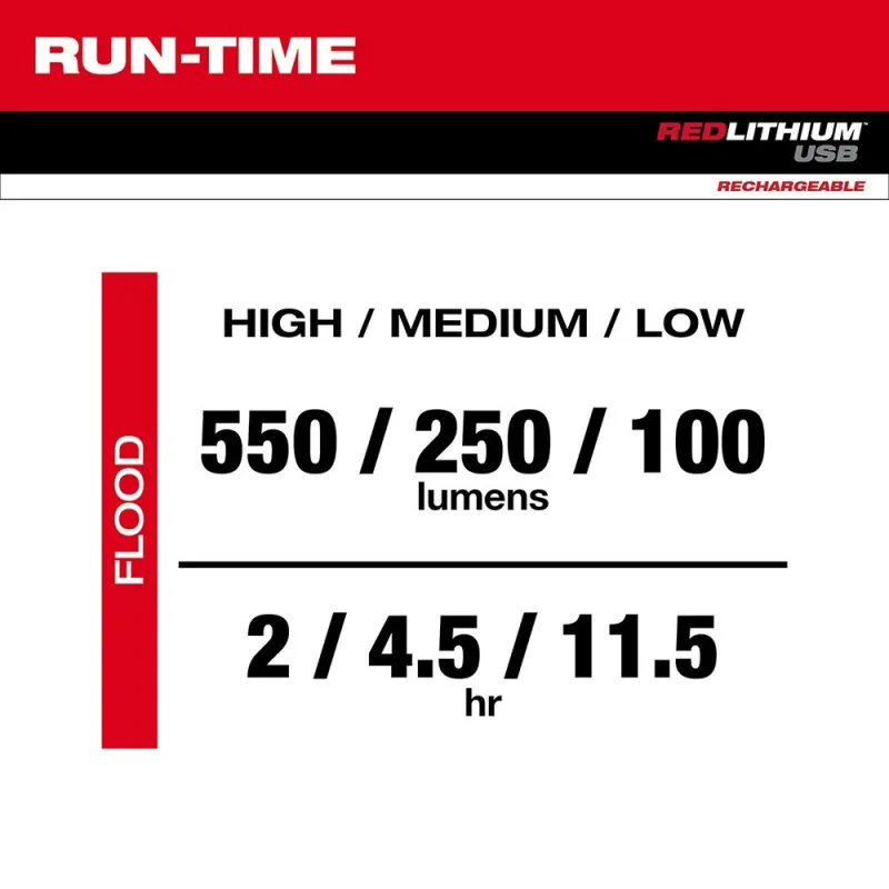 BEST-IN-CLASS OUTPUT IN ANY DIRECTION. Powered by REDLITHIUM® USB, the Milwaukee® USB Rechargeable ROVER™ Pivoting Flood Light delivers best-in-class output in any direction. With 550 lumens of TRUEVIEW™ High Definition output, the light heads 210° of rotation directs high output light to any work surface. A wide, magnetic base makes the USB Rechargeable Pivoting Flood Light perfect for positioning on common work surfaces or mounting to metal for hands free task lighting. It’s collapsible design fits into pockets and a built-in carabiner gives user the ability to clip it to tool organizers or straps for easy transport from task-to-task. Optimize your light output or runtime by using one of three different output modes and get up-to 11 hours of runtime. Charge REDLITHIUM® USB Batteries right inside the light via Micro USB or swap it out with an additional REDLITHIUM® USB Batteries for virtually no downtime. The Milwaukee USB Rechargeable ROVER™ Pivoting Flood Light is great for any trade professional and is covered by a limited lifetime warranty.