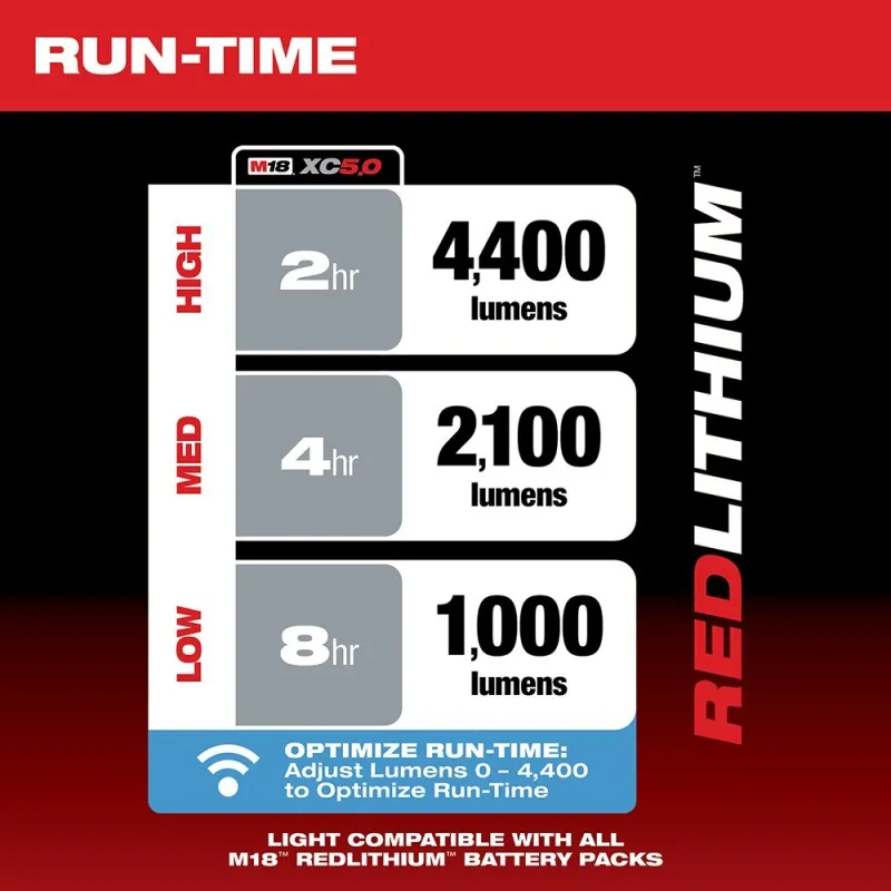 MOST VERSATILE LIGHT ON SITE – CUSTOMIZE, TRACK, MANAGE The new M18™ Radius™ LED Compact Site Light with One Key is the World’s first high output cordless site light on the market, and has the ability to provide light in task, area, and overhead applications. With 4,400 lumens of TRUEVIEW™ High Definition output, the M18™ Radius™ LED Compact Site Light provides enough light to illuminate large work areas, and can be turned down to as low as 1,000 lumens for working in confined areas. A high impact polycarbonate lens, and IP54 ingress protection allows it to live in the toughest conditions. The combination of these technologies offers professionals the highest quality LED lighting solution, on or off the jobsite.