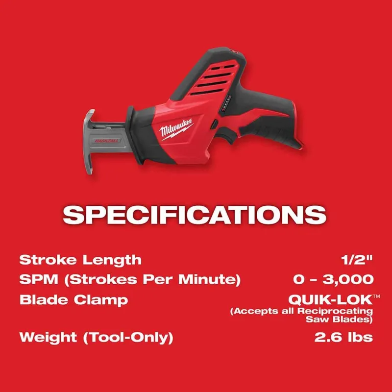At only 11” and 2.6 lbs, the HACKZALL® M12™ Cordless Recip Saw features a compact and light weight design for superior control and versatility in tight spaces. A powerful motor delivers 0-3,000 strokes per minute and a 1/2” stroke length allows for fast cutting through a wide range of material such as drywall, wood, and PVC. The variable speed trigger allows for a controlled cut while a QUIK-LOK® blade clamp offers fast and easy blade changes.