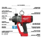 Our M18 FUEL™ 1″ High Torque Impact Wrench w/ ONE-KEY™ is the world’s first cordless 1” High Torque Impact Wrench. The POWERSTATE™ Brushless Motor delivers up to 1,800 ft-lbs of Nut-Busting Torque and 1,500 ft-lbs of fastening torque, making this the most powerful cordless impact wrench and enabling you to complete the most demanding applications. At only 12.9lbs with battery, the tool is up to 7 lbs. lighter than corded units, providing you with less fatigue while making overhead applications easier to complete on the job site. The battery-powered impact wrench provides you with cordless convenience and eliminates your need for compressors, generators, cords, and hoses. This reduces your cost of ownership by lowering energy costs and eliminating routine maintenance on compressors and generators. With no cord or hose, you have greater portability and the ability to complete applications you were not able to do with a corded or pneumatic unit. The REDLINK PLUS™ Intelligence ensures you achieve maximum performance and protects your High Torque Impact Wrench against overloads, over-heating, and over-discharge. M18™ REDLITHIUM™ Battery Packs are compatible with all M18™ tools, providing you with more work per charge and more work over the life of the pack. The 4-Mode DRIVE CONTROL™ provides you with greater control over the output speed and power of the powerful High Torque impact wrench . The ONE-KEY™ capabilities provide you with the ability to Customize, Track and Manage the impact wrench. ONE-KEY™ technology also gives you the ability to set a repeatable torque output for maximum control.