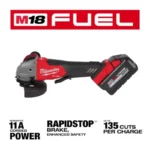 The MILWAUKEE M18 FUEL 4-1/2″ / 5″ Braking Grinder Paddle Switch, No Lock is the next advancement in power & performance, generating 11A corded power, fastest cutting, & delivering up to 135 cuts per charge. The M18 FUEL 4-1/2″ / 5″ Braking Grinder generates 11A corded power allowing you to complete the toughest grinding & cutting applications, all on the M18 Cordless System. The POWERSTATE Brushless Motor delivers maximum sustained power & 8,500 RPM to remove material faster & increase productivity. REDLINK PLUS Intelligence ensures unmatched levels of performance, protection, & compatibility. The RAPIDSTOP Brake provides stop times under two seconds with an abrasive disc. The M18 FUEL 4-1/2″ / 5″ Braking Grinder includes an electronic clutch for kickback protection, as well as overload protection to maximize motor life. The included M18 REDLITHIUM FORGE XC6.0 Battery Pack delivers you HIGH OUTPUT HD12.0 power in a smaller size to tackle the most demanding applications & provides you more work over the life of the pack. REDLITHIUM FORGE is Milwaukee’s MOST POWERFUL, FASTEST CHARGING, & LONGEST LIFE battery, which is fully compatible with the M18 system. With tool-free accessory & guard adjustments, you will experience faster accessory changes, & less downtime, while remaining fully compatible with the most common accessories in the market. The MILWAUKEE M18 FUEL 4-1/2″ / 5″ Braking Grinder takes cordless grinders to the next level in performance & run-time.