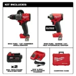 The MILWAUKEE M18 FUEL 2-Tool Combo Kit has the Most Powerful Drill, including AutoStop™ Control Mode for enhanced safety and the quietest fastening solution on the market. Includes an M18 FUEL™ 1/2″ Hammer Drill, M18 FUEL™ SURGE™ 1/4″ Hex Hydraulic Driver, (2) M18 REDLITHIUM™ XC 5.0Ah Battery Pack, with an M18/M12 charger and carrying case. The M18 FUEL™ ½” Drill Driver is the Industry’s Most Powerful Drill and Most Compact solution. The POWERSTATE™ Brushless motor delivers the most power under load to complete 2-9/16″ Self-Feed holes in dense materials for increased productivity and capability. At only 6.9” in length, this is the most compact drill in its class. The AutoStop™ Control Mode offers enhanced safety for the user by preventing over-rotation in a bind-up with the best reaction time in the industry. With Milwaukee’s new FLUID-DRIVE™ Hydraulic Powertrain, users will experience up to 50% quieter operation, 3X less vibration for smoother operation, and faster driving speeds compared to standard impacts. The POWERSTATE™ Brushless Motor delivers up to 0-3,000 RPM with constant power output to drive screws faster. REDLINK PLUS™ Intelligence is the most advanced electronic system on the market, preventing damage to the tool and battery caused by overloading or overheating. Milwaukee M18 FUEL™ 2-Tool Combo kit is part of the M18 system which is fully compatible with over 200+ solutions.