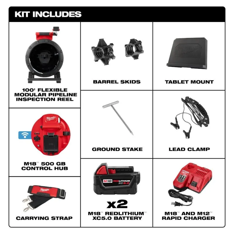 The MILWAUKEE M18 100’ Flexible Pipeline Inspection System has a flexible push cable providing the ability to navigate tight bends and traps while delivering the clearest image and easiest inspections in 1.5″- 4” lines up to 100’. Featuring the industry’s shortest 25 mm HDR self-leveling camera head, and the ability to digitally zoom up to 4X and pan, technicians can now see more in drain lines than ever before. The HDR self-leveling camera heads allow you to see both up close and further down the line with superior clarity, reducing washed-out areas and highlighting detail in dark conditions. The pitch sensing feature reads and displays the pitch on screen for easier diagnosis and more effective reporting. This system features a lightweight, compact design making this Milwaukee’s most portable inspection camera kit. Powered by M18 REDLITHIUM 5.0 batteries, the M18 500GB Control Hub powers the reels, stores recordings, and easily swaps between reel sizes delivering unmatched system versatility. Capture, create, and share custom photos and videos from one of Milwaukee’s compatible Pipeline Inspection viewing devices or directly from a tablet or mobile device for faster sharing of findings. This sewer line camera is also equipped with ONE-KEY Technology, providing you with the ability to track the tool’s location, manage it in inventory, and lock the tool out to help protect your investment.