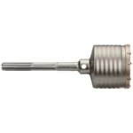 Milwaukee’s 1-piece Carbide tipped core bits are ideal for drilling large holes where the depth is relatively shallow. The core bit cuts a Kerf only. The inside core must be removed by the operator before deeper drilling can be accomplished. Use of centering bit 48-20-5495 is recommended (not included). Use drift key 48-20-5497 to remove centering bit from the 1-piece core bit. The 1-piece core bits are available in SDS-Max or spline shanks. They come in a variety of diameters ranging from 1-1/2 in. to 6 in. with overall lengths of 11-3/8 in. or 22 in. and a drilling depth of 3 in. The asymmetric tooth pitch with alternating tooth geometries creates faster material pulverization. The 1-piece design maximizes energy transfer and the thick wall core body is durable even in large hammers. The fluted core exterior minimizes friction loss and removes debris faster.