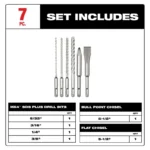 The MILWAUKEE MX4 4-Cutter SDS PLUS Drill Bits with solid head carbide deliver up to 5x longer life in concrete with rebar. Engineered with rebar guards to provide maximum durability in hard aggregate and rebar. The MX4 4-Cutter Bits are designed with sharp centering tips for exact spot drilling in concrete and metal decking. The 4-cutter design prevents lock-up in rebar, reducing downtime. Variable flutes remove dust faster, reducing heat and delivering up to 20% more holes per battery charge. The wear mark indicator on each drill bit shows you when the bit no longer meets the ANSI requirement. The MX4 4-Cutter Drill Bits are ideal for concrete with rebar and masonry applications. MILWAUKEE SDS Plus Chisels are made from high-grade, forged steel, providing up to 20% longer life. This kit includes (1) 5/32″, (1) 3/16″, (1) 1/4″, (1) 3/8″ MX4 4-Cutter SDS PLUS Rotary Hammer Drill Bits and (1) 5-1/2″ Flat, (1) 5-1/2″ Bull Point SDS Plus Chisels. Packaged in a medium, double-sided hard case designed for use in the MILWAUKEE PACKOUT™ Storage System.