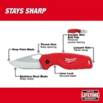 The MILWAUKEE® Compact Folding Knife features a thumb hole opening mechanism for easy, one-handed opening. The folding knife’s stainless steel blade stays sharp. This folding pocket knife features a liner lock that secures the blade while allowing for easy closure when done. The folding knife features a drop point blade. This pocket knife has a durable belt clip that reduces pocket tearing for maximum jobsite efficiency and includes a tether-ready lanyard hole.