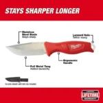 The Milwaukee® Tradesman Fixed Blade Knife is designed for optimal edge retention and durability. The stainless steel blade is engineered to stay sharper longer. A full metal tang provides durability for tough cuts. The durable molded sheath provides easy carry and storage.