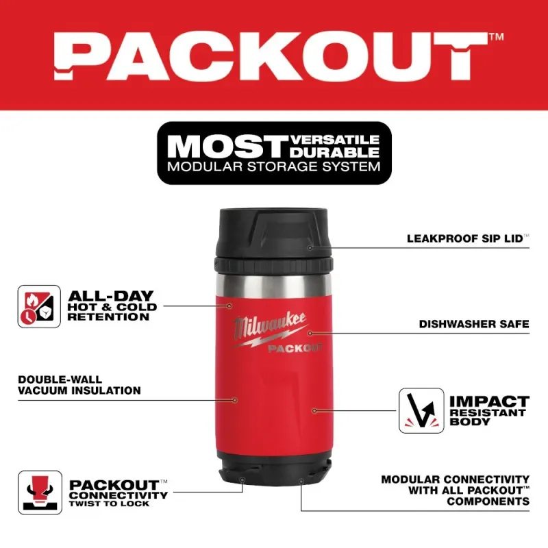 The MILWAUKEE PACKOUT 12oz Insulated Bottle with Sip Lid features twist-to-lock PACKOUT Connectivity so you can attach your bottle to the top of PACKOUT solutions, allowing for secure drink storage on the jobsite. The PACKOUT 12oz Insulated Bottle with Sip Lid has double wall vacuum insulation, keeping drinks hot or cold all day. The impact-resistant body is constructed with .8mm thick 18/8 stainless steel and a durable metal-reinforced handle to withstand harsh jobsite environments. The dishwasher-safe 12oz Insulated Bottle comes with a leakproof sip lid. MILWAUKEE PACKOUT is the industry’s most versatile and durable modular storage system.