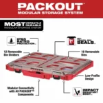 The PACKOUT™ modular storage system is the industry’s most durble and versatile storage system. The durable PACKOUT™ low-profile organizer is constructed with impact resistant materials. An IP65 rated weather seal protects tools, accessories, and small parts from rain and other jobsite debris. The organizer’s interior has 10 removable storage bins that are mountable for quick access. The transparent lid of the shallow organizer seals the bins to prevent contents from migrating and shifting. Heavy duty latches and reinforced hinges ensure that the slim organizer protects and contains its contents. The PACKOUT™ modular storage allows users to customize and build their own storage system to easily transport and organize tools and accessories.