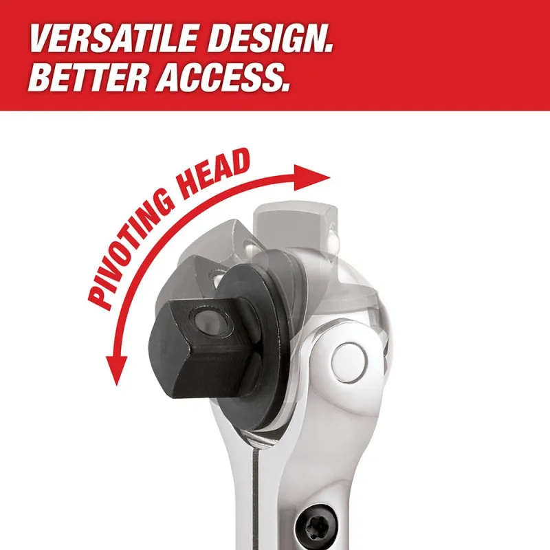 Milwaukee’s 12pc 3/8” Drive Ratchet Set delivers ultimate versatility and access. The slim-profile ratchet features a pivoting head that can be used as a ratchet, a nut driver, or any angle in between. Milwaukee’s proprietary sockets feature a parallel flat design for wrench compatibility and to deter rolling. Socket sizes are stamped into the flats for improved visibility. The kit is stored in a soft-sided carrying case that includes a socket rail to keep sockets and accessories organized, both on and off the jobsite.
