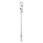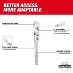The MILWAUKEE 1/2” Drive 18” Flex Head Ratchet with a 4? arc swing provides better access and is more adaptable to working in spaces with different angles. The ratchet head can flex to 11 different positions and has a lever to lock the head in place. The extended handle length offers increased leverage for stubborn nuts and bolts, a slim profile design, and a flush directional lever for better accessibility. The all-chrome finish makes cleaning the extended-reach ratchet easy. This ratchet is backed by Milwaukee’s Mechanics Hand Tools Lifetime Guarantee.