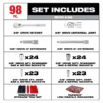 The MILWAUKEE 98pc 3/8″ Drive 6-Point and 12-Point Ratchet and Socket Set feature sockets with FOUR FLAT Sides that deter rolling and are wrench compatible for maximum productivity. The 90-tooth ratchet tool provides 4° of arc swing and a slim profile for work in tighter spaces. The laser-engraved size markings provide easy identification, and chrome plating offers rust and corrosion protection. The SAE & Metric 6-point and 12-point sockets come organized in a PACKOUT Low-Profile Organizer, which comes equipped with a clear top for easy identification of parts at a glance. This PACKOUT Organizer is IP65-rated and built from impact-resistant materials for durability on and off the job site with a reinforced hinge and heavy-duty latches. The Low-Profile Organizer is part of the MILWAUKEE PACKOUT Modular Storage System, which is the most versatile and durable in the industry. A Limited Lifetime warranty covers the PACKOUT Low-Profile Organizer, while a Lifetime Guarantee backs the ratchets and sockets.