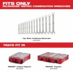 The MILWAUKEE 15PC Metric Combination Wrench Trays fit within the PACKOUT Compact Organizer for ultimate organization. The color-coded trays with easy-to-read size labeling provide quick tool identification. The bottom tray also includes side compartments for extra hardware or accessory storage. The storage trays ONLY FIT the following Milwaukee wrench set: 15PC Metric Combination Wrench Set (48-22-9515).