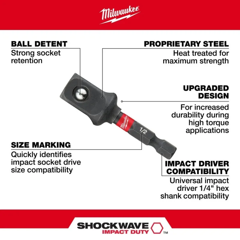 The MILWAUKEE® SHOCKWAVE™ 1/4 in. Hex to 1/2 in. Square Socket Adapter allows impact sockets to be used with impact drivers. The SHOCKWAVE Impact Duty™ socket adapters are made from a proprietary steel, heat treated to control hardness and provide durability with up to 50X life. The socket adapter has a heavy-duty construction for fastening capabilities in all impacts, built to withstand frequent use and save the expense of having to buy a separate drill driver. Milwaukee hex to square socket adapters are engineered for maximum durability and long-lasting use. This impact socket adapter is designed for use with impact drivers and impact sockets.