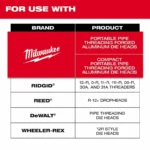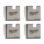 MILWAUKEE® Portable Pipe Threading Dies are replacements for: MILWAUKEE® Forged Aluminum Die Heads, MILWAUKEE® Compact Forged Aluminum Die Heads, RIDGID 11-R, 12-R, O-R, 111-R, 00-R, 30A and 31A Threaders, Reed R-12+ Dropheads, DeWalt Pipe Threading Die Heads, and Wheeler Rex 12R Style Die Heads. Offered in Alloy and High-Speed Tool Steel sizes 1/2″-2″.  Milwaukee’s High-Speed Dies have the ability to thread Stainless Steel Pipe. Stamped size, type and alignment numbers for easy identification and installation.