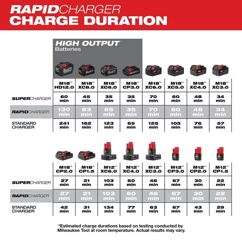 The M18™ & M12™ Rapid Charge Station is the fastest charging solution in the industry. With the ability to Charge 6 Packs 4X Faster, the station charges three batteries simultaneously while charging each pack up to 40% faster. The charger accepts up to (3) M18™ & (3) M12™ battery packs, reducing the amount of time spent changing out batteries and increasing productivity on the jobsite. Featuring REDLINK™ Intelligence, it communicates directly with the battery to monitor cell voltage, temperature, and charge status to optimize the performance and extend the life of the pack. The station has integrated hang holes for vertical mounting, a pass through plug to conserve outlet space, and a convenient carry handle to transport packs on and off the jobsite.