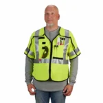 The MILWAUKEE® 4XL/5XL AR/FR CAT. 1 Class 3 Breakaway High Visibility Safety Vest is engineered to carry more with lightweight protection. The Arc-Rated and Flame-Resistant Vest has ten pockets, including pen pockets, chest pocket with closure, and external pocket for easy access to essential items while on the job. AR/FR lightweight WESTEX® DH by Miliken® DH material provides added comfort when wearing the vest as part of a complete AR/FR garment system and rated to an ATPV of 5.7 cal./cm². The yellow safety vest features a quick external size adjustment for better fit and a durable pass-through slit for fall protection gear. The vests are compliant with NFPA 2112 for protection against flash fires and arc flash hazards. Class 3 high visibility vests are recommended for working in environments requiring additional visibility, traffic traveling over 50 MPH, and/or around heavy machinery. AR/FR CAT. 1 Class 3 Safety Vests are ANSI and CSA compliant and can be customized by adding a logo.