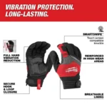MILWAUKEE Anti-Vibration Work Gloves protect users’ hands from harmful vibrations while operating power tools. These Anti-Vibration Gloves provide users with full hand vibration reduction while still maintaining dexterity and comfort. These long-lasting gloves are reinforced in high-wear areas like fingertips, palms, and in between your thumb and pointer finger, making them durable for everyday tasks. The integrated Smartswipe knuckle is designed to allow the use of smartphones and touch screens, without removing gloves or wiping dirty fingertips across the screen. In addition, a breathable lining and built-in terry cloth sweat wipe ensure the gloves remain comfortable all day.
