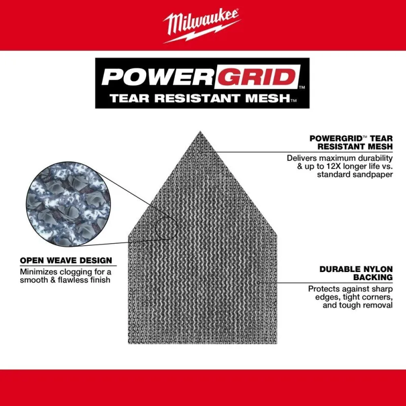 The MILWAUKEE Mesh Sanding Sheets for M12 FUEL Orbital Detail Sander are designed with MILWAUKEE POWERGRID Tear Resistant Mesh for maximum durability, delivering up to 12x longer life vs. standard sandpaper. These Mesh Sanding Sheets use an open weave design to minimize clogging and reduce material build-up for a smooth and flawless finish. The durable nylon backing increases protection against sharp edges, tight corners, and tough material removal applications while utilizing sharp aluminum oxide grain for faster finishing. The reusable mesh sanding sheets are easy to clean for longer life; simply shake, vacuum, blow or rinse to clear away debris. The high-quality hook and loop provides a secure connection and fast grit swaps. Sanding sheets are available in 80 grit – 400 grit for use in wood, metal, and plastics.