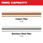 The MILWAUKEE 1-1/4″ CTS-V Pivoting Press Ring is designed for use with M18 & M12 FORCE LOGIC Press Tools. The 1-1/4” CTS-V Pivoting Press Ring is a more efficient alternative to sweat and solder, enabling you to press connections on copper and copper tube-sized (CTS) stainless steel pipe. Pivoting functionality delivers greater access in tight spaces when paired with the X3 Ring Jaw & M12 FORCE LOGIC Press Tool or the X4 Ring Jaw & M18 FORCE LOGIC Press Tools. Additionally, Milwaukee’s press blocking system prevents improper ring and ring jaw mismatch providing peace of mind in quality connections. The 1-1/4″ CTS-V Pivoting Press Ring, combined with the ring jaw and in-line M18 & M12 FORCE LOGIC Press Tools, deliver unrivaled access in tight spaces and around installed pipes, providing you with controlled, flameless copper connections for unmatched productivity.