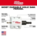 The Milwaukee 2-1/8″ Hole Dozer Bi-Metal Hole Saw with Arbor & Pilot Bit is designed for durability and efficiency, featuring a bi-metal construction with 8% cobalt for increased wear resistance.