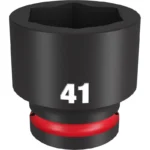The MILWAUKEE® SHOCKWAVE Impact Duty™ 3/4″ Drive 41MM Standard 6 Point Socket features the boldest, longest-lasting markings and extreme impact durability in high torque applications. The stamped and ink-filled size marking enables an accurate socket selection every time throughout the life of the socket. Engineered with high-strength forged steel for optimized performance in heavy-duty applications, and a non-slip hex geometry prevents fastener rounding. The dual-hole design and ring groove allow for easy socket attachment and removal. All SHOCKWAVE Impact Duty™ Sockets are backed by a Lifetime Guarantee and meet ASME industry standards. Compatible with optional Retaining Ring (49-66-6744).