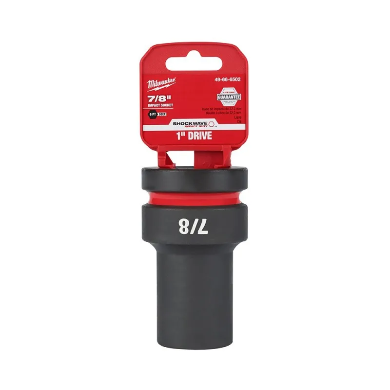 The MILWAUKEE® SHOCKWAVE Impact Duty™ 1″ Drive 7/8″ Deep 6 Point Socket features the boldest, longest-lasting markings and extreme impact durability in high torque applications. The stamped and ink-filled size marking enables an accurate socket selection every time throughout the life of the socket. Engineered with high-strength forged steel for optimized performance in heavy-duty applications, and a non-slip hex geometry prevents fastener rounding. The dual-hole design and ring groove allow for easy socket attachment and removal. All SHOCKWAVE Impact Duty™ Sockets are backed by a Lifetime Guarantee and meet ASME industry Deeps. Compatible with optional Retaining Ring (49-66-6745).