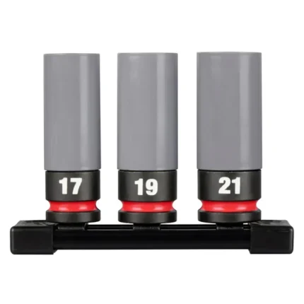 MILWAUKEE SHOCKWAVE Impact Duty 1/2 Drive 6 Point Lug Nut Wheel Sockets feature the Most Durable, Non-Marring Sleeve to protect rims during tire changes. The ARMOR-GUARD Sleeve is made with premium, durable plastic for Lasting Protection against cracking or shredding during wheel installation and removals. The sockets are thin-walled for easy access in tight wheel assemblies and feature a non-marring plastic insert to protect lug nuts during use. The sleeves are color-coded, Gray for Metric sizes and Red for SAE sizes, to ensure easier socket selection while also featuring stamped & ink filled sizes for the Boldest, Longest Lasting markings. Milwaukee sockets are engineered with high strength forged steel for optimized performance in heavy-duty applications. The dual-hole design and ring groove allow for easy socket attachment and removal. MILWAUKEE SHOCKWAVE Impact Duty Lug Nut Wheel Sockets are optimized for use with 1/2″ drive impact wrenches, drivers, ratchets, and adapters and meet ASME industry standards for thin-walled sockets.